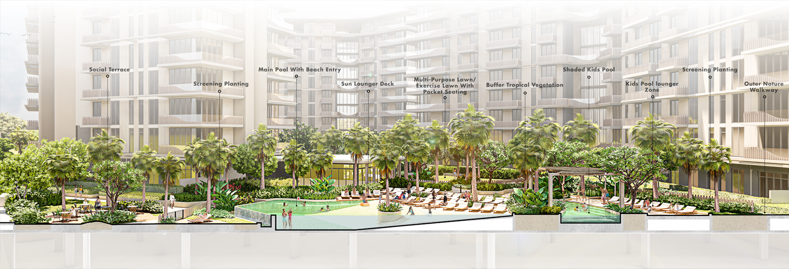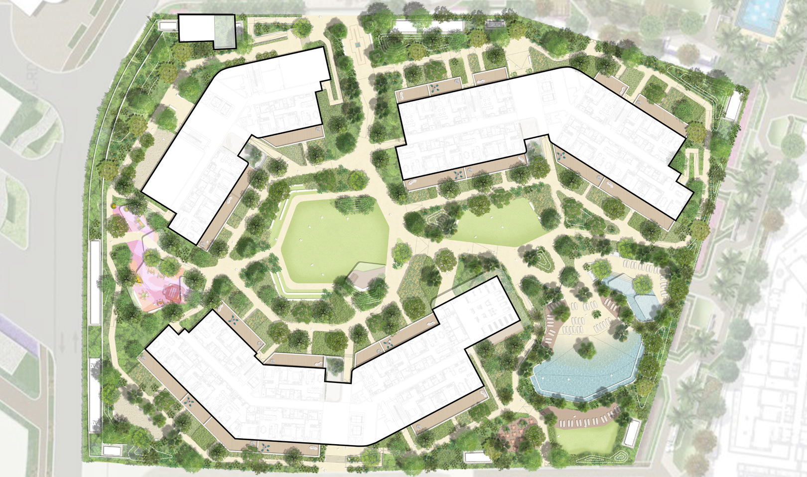 The main landscape for the project was located on Ground Level whereby two key character zone were created, the Central Park and the outer pool area. The park would act as a central green amenity and include features such as play mounds, amphitheatre style seating and BBQ areas. In addition to providing a central community space, it also provided a large proportion of apartments with uninterrupted green vistas.