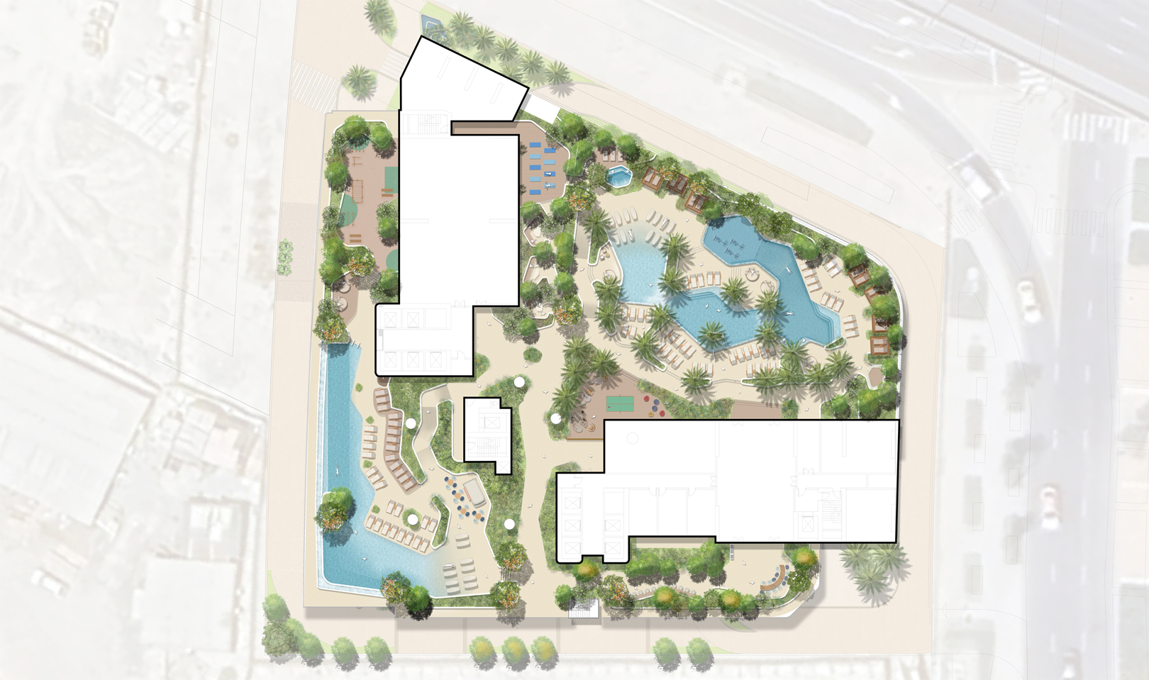 Rove Home Marasi Drive was the second offering from the Rove Home brand following the huge success of the flagship Rove Home Downtown Project. SCLA developed the Landscape Concept with a different approach to that of Rove Home Downtown which acknowledged the project being located slightly further out from bright lights of Downtown Dubai. The design was developed with more of a focus on serenity and ambience and seeked to provide residents with a moment of calm and peace whilst still feeling like they’re in the heart of Dubai.